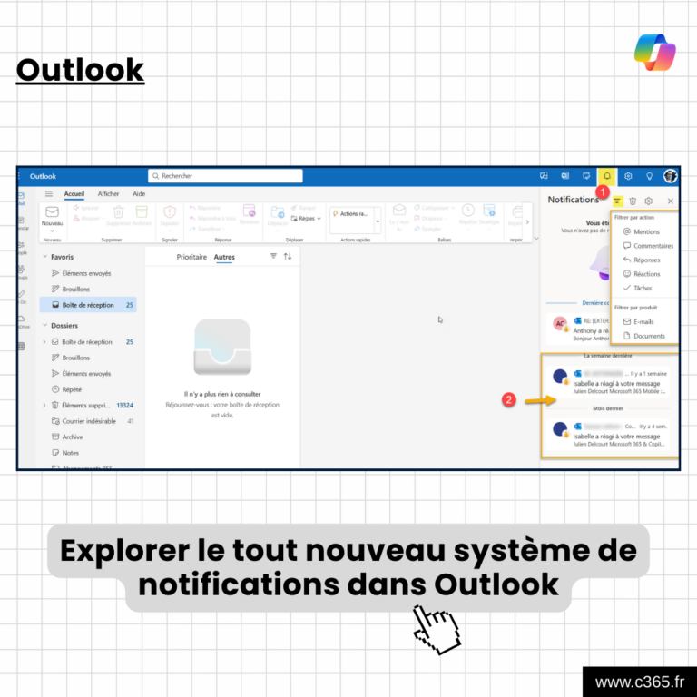Le nouvel Outlook repense son système de notifications. Fini les alertes éparpillées et difficiles à suivre : le nouveau système de notifications centralise mentions, commentaires, réponses et réactions en un seul endroit.