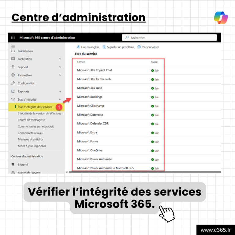 Le tableau de bord « État d’intégrité des services » (Service Health) est votre tour de contrôle. Intégré nativement au Centre d’administration Microsoft 365, il recense en temps réel l’état opérationnel de chaque brique de l’écosystème (Exchange, SharePoint, Entra ID,…
