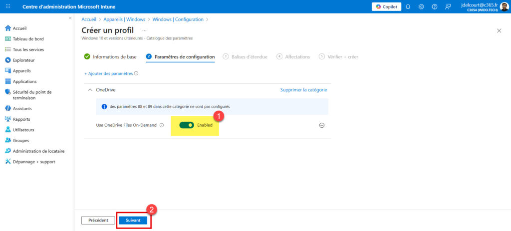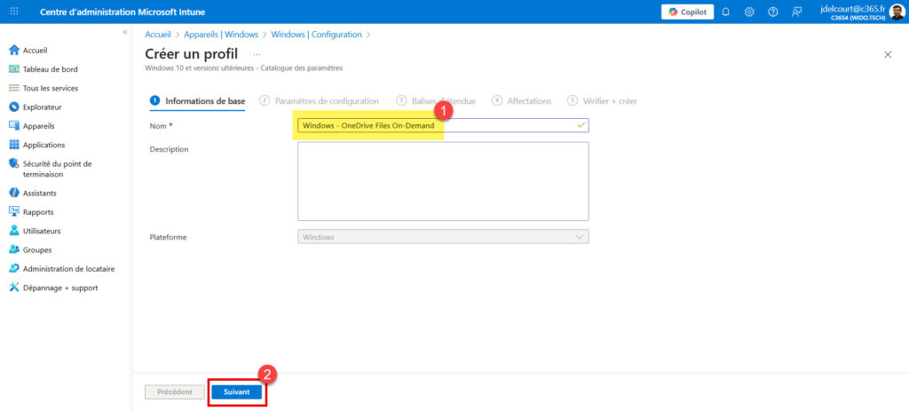 - Dans l’onglet Informations de base, donnez un nom explicite à votre profil (ex: Windows – OneDrive Files On-Demand) et cliquez sur Suivant.