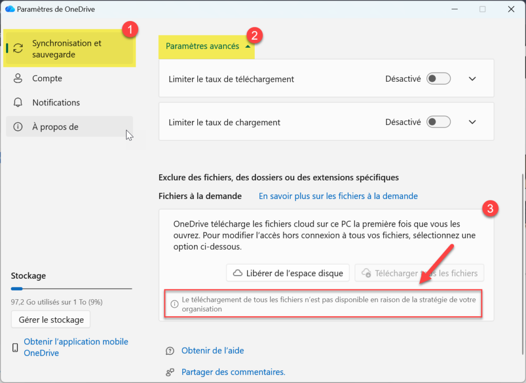- Via l’application OneDrive : Cliquez sur l’icône OneDrive (nuage) > Paramètres > Synchronisation et sauvegarde. L’option « Libérer de l’espace disque » doit être active et « Télécharger tous les fichiers » grisée (gérée par l’organisation).
