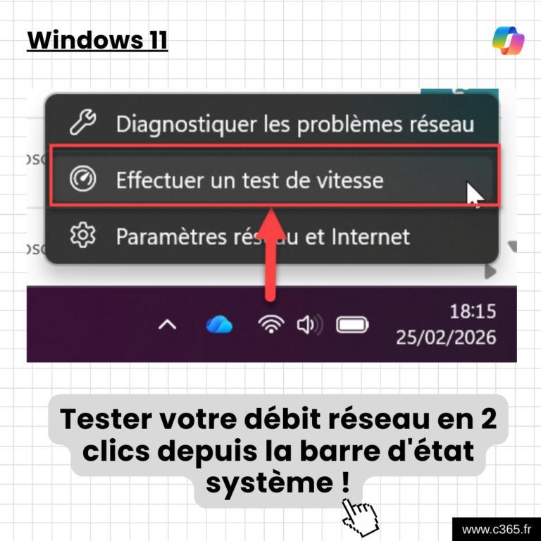 Avec la mise à jour KB5077241 (déployée le 24 février 2026), Microsoft intègre une nouvelle fonctionnalité pour tester la vitesse de votre connexion Internet. 📌 Comment y accéder ?→ Clic droit sur l’icône réseau dans la barre d’état système→ Sélectionnez…